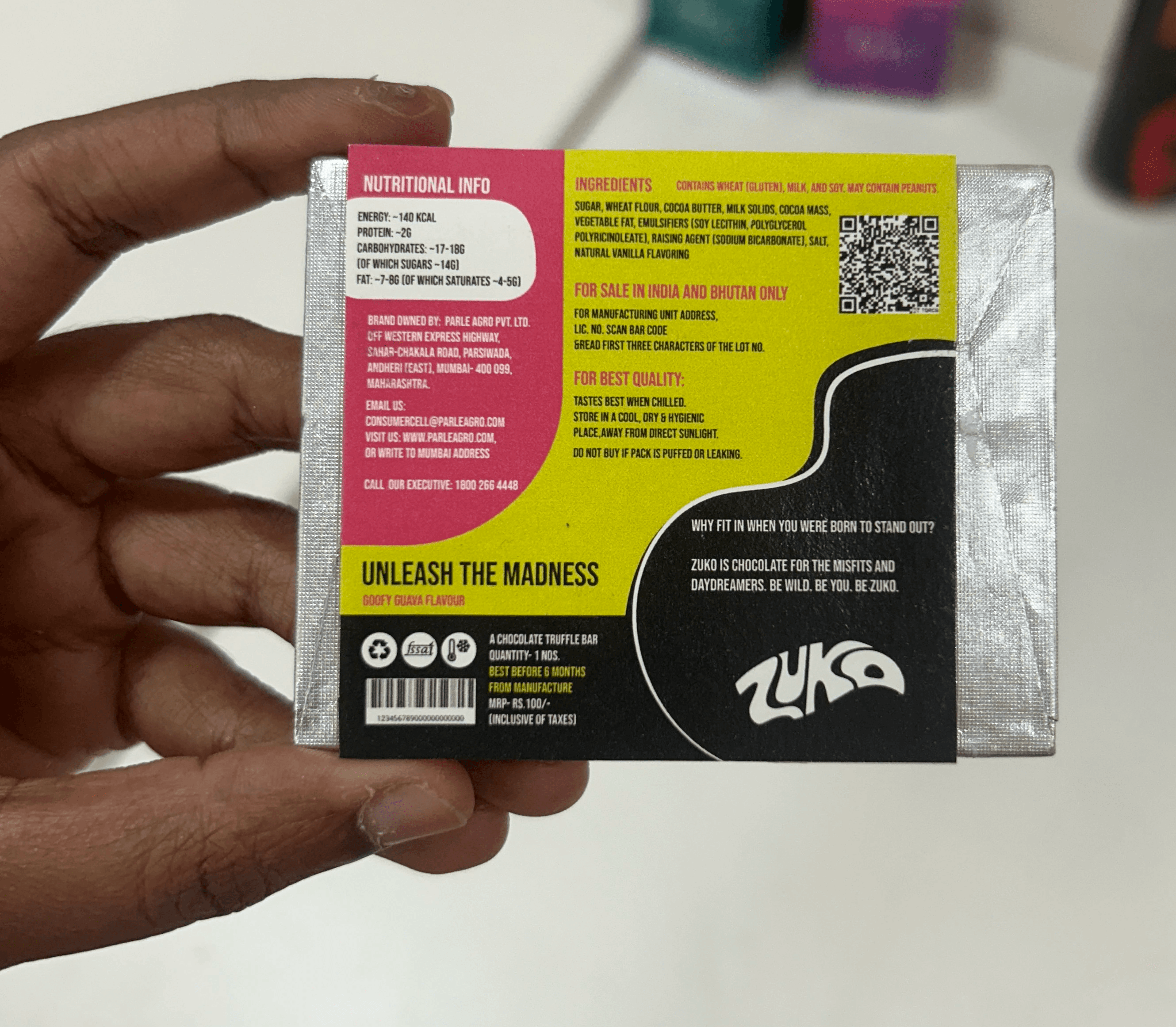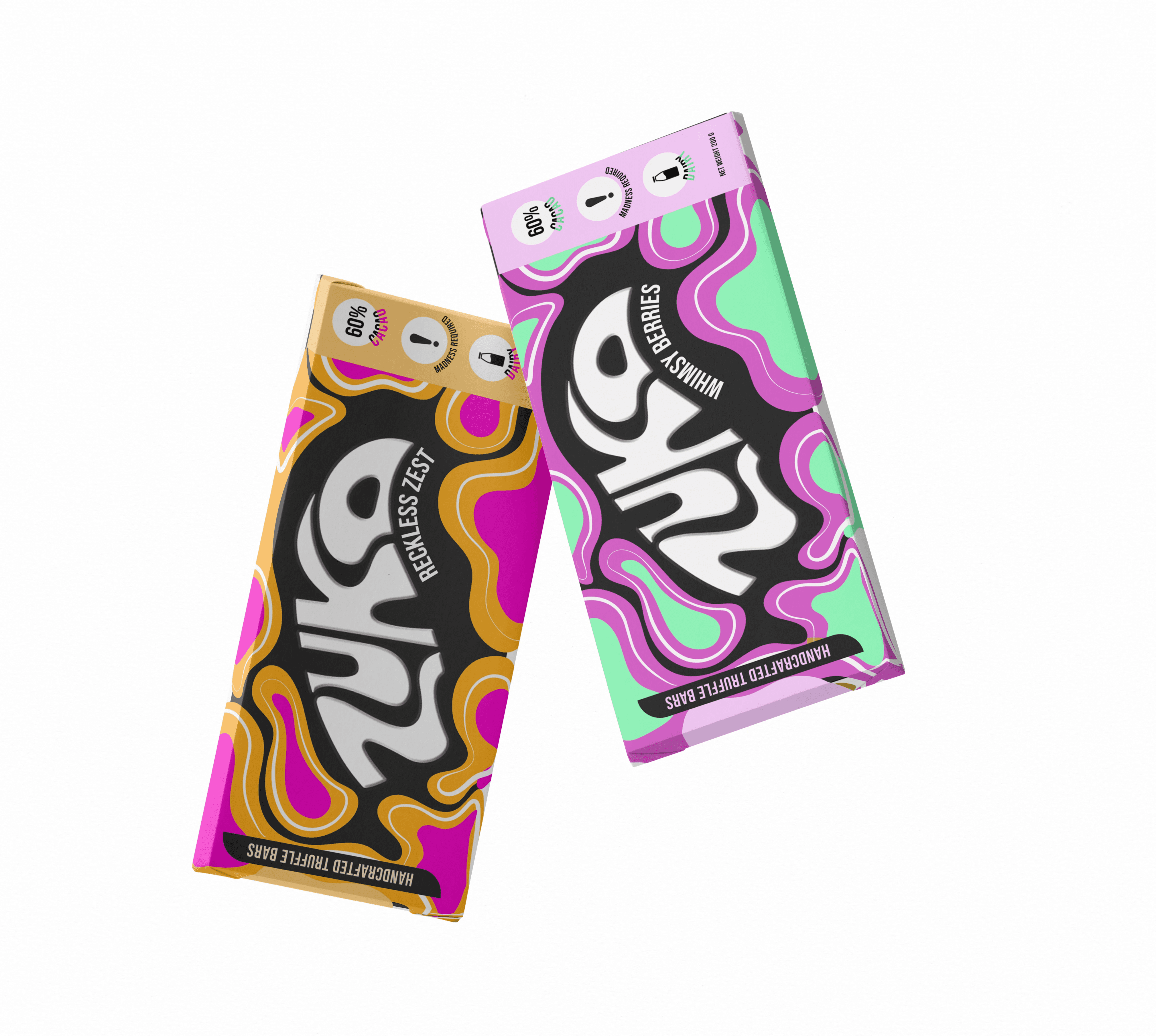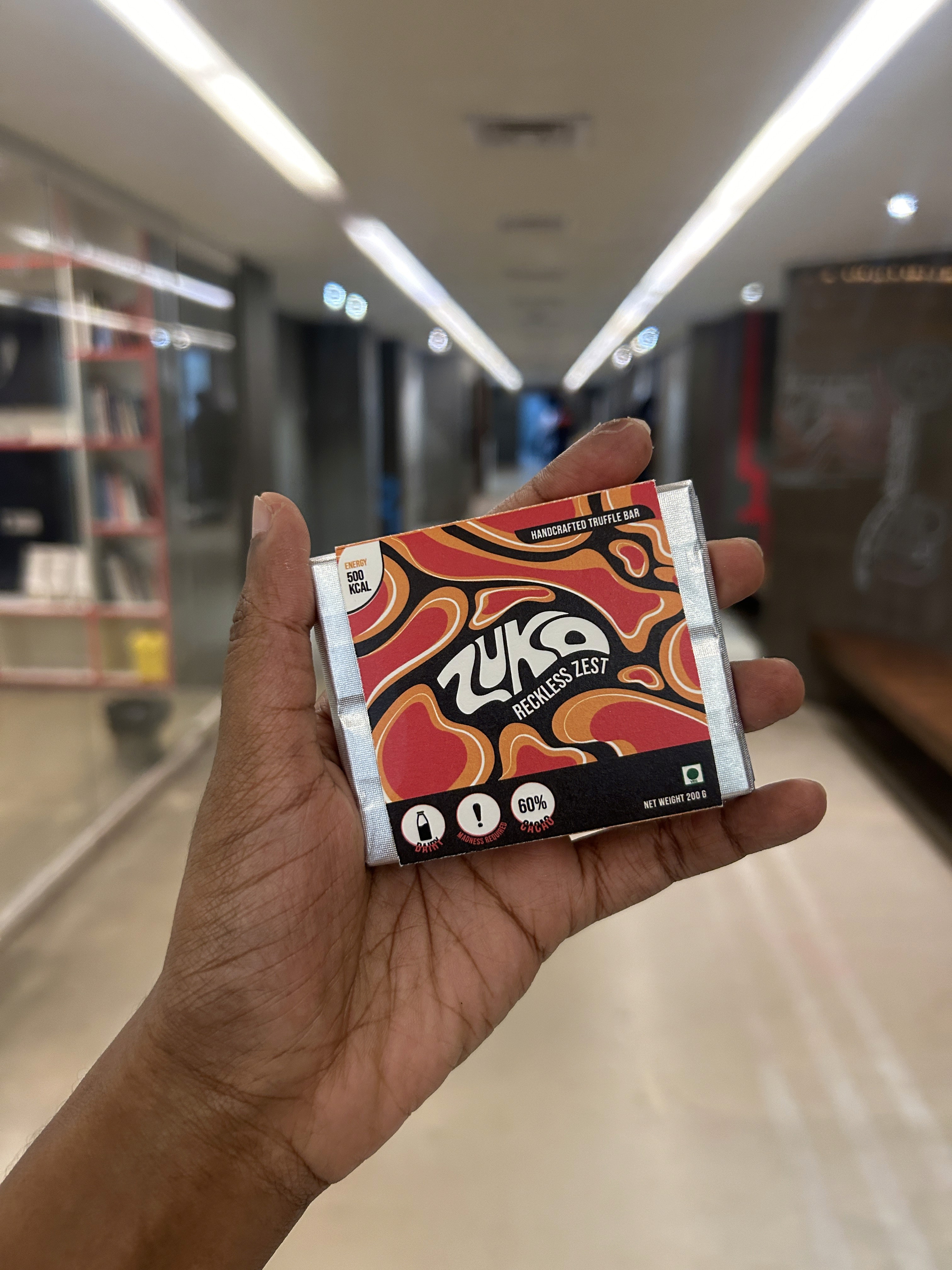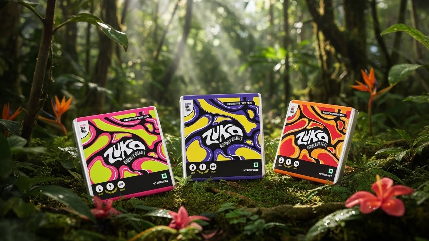 Zuko is a handcrafted chocolate truffle bar brand that delivers wild, vibrant flavors wrapped in rich chocolate, celebrating individuality and playful rebellion. The flavours being- Reckless Zest Whimsy Berries, Goofy Guava also show the brand personality of Zuko.